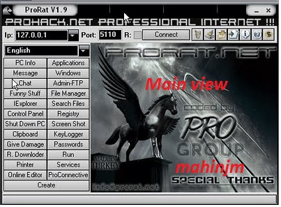 ProRat v1.9 একটি অত্যান্ত শক্তিশালী প্রোফেশনাল হ্যাকিং সফটওয়্যার। এই সফটওয়্যার দিয়ে খুব সহজে আপনি অন্যের পিসি আপনার নিয়ন্ত্রন আনতে পারেন শুধু তাই না । আরো আছে পিসি নিয়ন্ত্রন ব্যাবস্থা ভেঙ্গে দেওয়া, পিসির সকল ড্রাইভ ফরমেট করা, সব পাসওয়ার্ড চুরি করা, ইচ্ছা মত লগ অফ করা, Restart করা, পিসি তে কি করতেসে তা জানা। এসব কিসু জানতে পারেন আপনার কম্পিউটার বসে। কাজ শুরু করার আগে এন্টিভাইরাস disable করে নিন । তা নাহলে এন্টিভাইরাস এটিকে virus হিসেবে ডিটেক্ট করবে ।