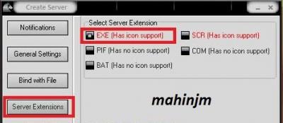 ৭ । এরপর Server Extensions ট্যাবে ক্লিক করুন এবং .EXE (Has icon support) সিলেক্ট করা ভাল । কারন এতে আপনি আইকন সাপোর্ট পাবেন, ফলে ভিকটিমকে ধোঁকা দেওয়া সহজ হবে।