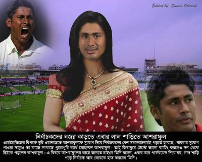 ওয়েস্টইন্ডিজ সিরিজে দুটি ওয়ানডেতে আশরাফুলকে সুযোগ দিয়ে নির্বাচকদের বেশ সমালোচনাতেই পড়তে হয়েছে। বারবার সুযোগ পাওয়া স্বত্ত্বেও তা কাজে লাগাতে পুরোপুরি ব্যার্থ হয়েছেন মোহাম্মদ আশরাফুল। তাই জিম্বাবুয়ে টেস্টে ভালো ব্যাটিং করলেও দল থেকে ছিটকে পড়তে হলো তাকে। এ বিষয়ে আশরাফুলের কাছে জানতে চাইলে তিনি বলেন, এবার আর পার্ফরমেন্স দিয়ে নয়, লাল শাড়ি পড়ে নির্বাচক আর কোচকে হাত করবেন তিনি।