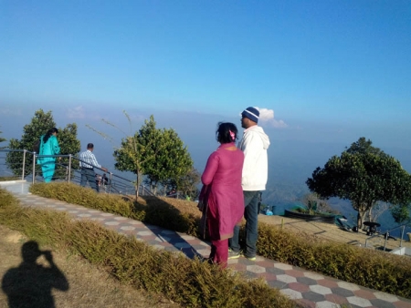 পাহার থেকে নেমে আবার গাড়িতে উঠলাম। পথি মধ্যে আবার একবার থেমে পাহারি পেপে খেলাম। পাহারী পেপে বেশ মিষ্টি। যতই সামনে আগাচ্ছি ঠান্ডাটা যেন হিম হতে শুরু করেছে। বান্দবানে শহরে থাকতে বেশ গরম লেগেছিলো ছোট ভাইরা তাই গরম পোশাক আনেনি। আমাদেরকে ড্রাইভার বলে দিয়েছিলো গরম পোশাক নিতে। তাই সঙ্গে এনেছিলাম। ড্রাইভারকে মনে মনে একটা ধন্যবাদ জানালাম। গরম পোশাকটা পড়ে নিলাম। বেলা সারে চারটার দিকে বিশাল উচ্চতার সেই নীলগিরীতে পৌছালাম। ওহহো! কি দৃশ্য! মনে হচ্ছে একটা উপগ্রহ থেকে বুঝি পৃথিবীকে দেখছি ! এখানে আর্মি ক্যাম্প করেছে। তারা জায়গাটাকে খুব সুন্দর করে পরিস্কার করে কতোগুলো কটেজ তৈরি করেছে। সুন্দর সুন্দর স্পট গুলোতে স্টিলের রেলিং দিয়ে দিয়েছে। বিভিন্ন ফুলের বাগান করেছে। চমৎকার জায়গা। একবার মনে হলো জান্নাত কি এমন সুন্দর হবে। হে আল্লাহ জান্নাত যেন এমন সুন্দর হয়। দূরে মেঘ দেখা যাচ্ছে যা আমাদের থেকে নিচে মানে আমরা মেঘের উপরে চলে এসেছি। সাদা মেঘের গুচ্ছ দেখার জন্য উপরে তাকতে হয় না, নিচের দিকে তাকাতে হয়। ছবি তুললাম পটাপট।