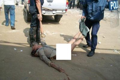 (ছবি: গুলিতে নিহত একজনকে টেনে হিচড়ে নিয়ে যাচ্ছে পুলিশ)