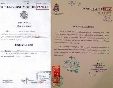 মানবতাবিরোধী অপরাধে মৃত্যুদণ্ডাদেশ পাওয়া বিএনপি নেতা সালাউদ্দিন কাদের চৌধুরীর পক্ষ থেকে আদালতে উপস্থাপন করা সনদপত্র জাল ছিল। জাল সনদ দিয় আবারো অাদালতকে বিভ্রান্ত করা চেস্টা করে এই যুদ্ধাপরাধী সাকা। তার পক্ষ থেকে আপিল বিভাগে জমা দেওয়া হয়েছে পাকিস্তানের পাঞ্জাব বিশ্ববিদ্যালয়ের একটি ডুপ্লিকেট সার্টিফিকেট। যে সার্টিফিকেটে সেশন ১৯৭১ দেখানো হয়েছে। এছাড়া প্রশংসাপত্রে সেশন দেখানো হয়েছে ১৯৭০-৭১। এমনকি সার্টিফিকেটে ১৯৭০ লেখার মধ্যে ১৯ সংখ্যাটি বড়, আর ৭০ সংখ্যাটি খুব ছোট। পাশাপাশি সার্টিফিকেট ও প্রশংসাপত্রে পাঞ্জাবের বানানও দু’রকম। একটাতে লেখা Punjab আরেকটাতে লেখা Panjab। এই দুই বানানের কারনে দুই দেশের বিশ্ববিদ্যালয়ে একই সাথে পড়ার ইতিহাসও রচনা করলো সাকা।