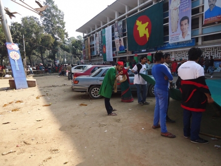 যাদুঘরের সামনে সামহ্যোয়ারইন ব্লগের ব্যানার টাঙানো হচ্ছে।