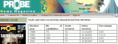প্রোবনিউজ ম্যাগাজিনের মে মাসের 26 তারিখের সংখ্যায় জামাতীদের ভোট ও ভবিষ্যত নিয়ে একটি চমৎকার বিশ্ল্লেষণী লেখা প্রকাশ পায়। 1986 সাল থেকে শুরু করে গত 4টি নির্বাচনে জামাতের ভোটের সংখ্যা তেমন একটা বাড়েনি। 2001 সালে বিএনপি'র সাথে জোটবদ্ধ হওয়ার কারণে যদিও জামাতীরা 31টি আসনে প্রতিদ্বন্দ্বিতা করে 17টি আসন জয় লাভ করে তবুও তারা মোট ভোটের মাএ 4.29% ভোট পায়। প্রতিবেদনটিতে বলা হয়, আগামী নির্বাচনে জামাত 50টি আসনে প্রতিদ্বন্দ্বিতা করবে। কিন্তু মাঠ পর্যায়ে জামাতীদের নির্বাচিত এলাকায় বিএনপি'র সাথে দ্বন্দ্ব বাড়ছে। এসব এলাকায় জামাতীরা নির্বাচন করলে স্থানীয় বিএনপি নেতারা স্বাধীন প্রার্থী হিসেবে অংশগ্রহণ করতে পারে যা জোট সরকারের জন্য অত্যন্ত বিপজ্জনক হবে। বর্তমানে জামাতের 16টি আসনের মধ্যে কেবল 5টি আসন নিরাপদ বলে মনে করা হয়। বাকীগুলোতে জামাত আদৌ জয় লাভ করতে পারবে কি-না এব্যাপারে যথেস্ট সংশয় আছে। গত 15 বছরে জামাতের ভোট বৃদ্ধির হার মাএ 2.87%। প্রতিবেদনটিতে স্পস্ট করে বলা হয়, জামাতীদেরকে স্থানীয় পর্যায়ে বিএনপি'র পুরোপুরি সমর্থন দরকার। না হলে তারা পরবর্তী নির্বাচনে সম্পূর্ণভাবে পর্যুদস্ত হবে।