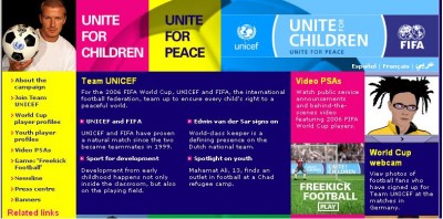 বিভিন্ন দেশের ফুটবল এসোসিয়েশনের সাথে যুক্ত হয়ে ইউনিসেফ শিশুদের জন্য নিরাপওা, শান্তি ও যত্নের প্রতিশ্রুতি দিতে চায়। এবছর জুনের তিরিশ তারিখে ফিফা ও ইউনিসেফ বর্ণবৈষম্যের প্রতি রেডকার্ড দেখিয়ে প্রচার করেছে "বর্ণবৈষম্যকে না বলুন"। খেলার মাধ্যমে শান্তি, সৌহার্দ্য ও ভাগ্য পরিবর্তনের জন্য সম্মিলিত প্রচেস্টায় আপনিও যোগ দিতে পারেন। দেখতে পারেন ভাগ্য বিড়ম্বিত শিশুদের চিএ। দেখতে পারেন আপনিও এই চমৎকার আয়োজনের সাথে কিভাবে অংশগ্রহণ করতে পারেন। শিশুরা যদি সুন্দর আগামী দিনের জনক হয়, তাহলে আজকের আমরা তাদেরকে বাদ দিয়ে কিভাবে উন্নয়নের কথা ভাবতে পারি? যারা আগ্রহী তাদের জন্য: