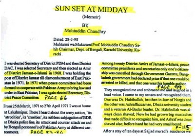 আমরা কি রাজাকার মহীউদ্দীন চৌধুরীকে চিনি? আমরা কি জানি যুদ্ধাপরাধী গোলাম আযমের মতো তিনিও স্বাধীন বাংলাদেশের নাগরিকত্ব হারিয়েছেন? বর্তমানে তিনি পাকিস্তানের নাগরিক হিসেবে করাচীতে বসবাস করছেন। সেই রাজাকার মহীউদ্দীন চৌধুরীর ডায়েরী 1998 সালে "সানসেট অ্যাট মিডডে" নামে প্রকাশিত হয় পাকিস্তান থেকে। আমি জালাল ভাইয়ের কাছে কৃতজ্ঞ [লিংক=যঃঃঢ়://িি.িভৎবববিনং.পড়স/ধসৎধবশধংযর/সড়যরঁফফরহ.ফড়প] রাজাকার মহীউদ্দীনের বইটির[/লিংক] বিভিন্ন পৃষ্ঠা থেকে উদ্ধৃতির সংকলন তুলে ধরার জন্য। মহীউদ্দীন চৌধুরীর বইটি মুক্তিযুদ্ধকালীন রাজাকারদের কর্মকান্ড তুলে ধরে। তুলে ধরে স্বাধীনতার পরে গোপনে কিভাবে দেশ থেকে পালিয়ে তারা পাকিস্তানে নতুন জীবন শুরু করেছিলেন। স্বদেশ থেকে বিতাড়িত মহীউদ্দীন 1973 সালে করাচী বিশ্ববিদ্যালয়ে বাংলা বিভাগে অধ্যাপনা শুরু করেন। তার বইতে নোয়াখালী জেলার অনেক রাজাকারের নাম উঠে এসেছে। যুদ্ধাপরাধী হিসেবে বিচারের ঠিক আগ মুহুতের্্ব স্বীকারোক্তিমূলক জবানবন্দী দিয়ে হয়তো নিজের অজান্তেই ঐতিহাসিক তথ্যগুলো তুলে ধরেছেন বেচারী মহীউদ্দীন। এদেশে যুদ্ধাপরাধী হিসেবে রাজাকার এবং তাদের পুনর্বাসনের কৃতিত্বের জন্য সামরিক নেতা জিয়া ইতিহাসে ক্ষমাহীনভাবে ধিকৃত হবেন সবসময়ই। আমি নিশ্চিত, আগামীতে কোন একদিন যুদ্ধাপরাধের জন্য তাদের বিচারও হবে জাতীয় ও আন্তর্জাতিক পর্যায়ে। এদেশের স্বাধীনতার সংগ্রামে রাজাকার ও আলবদর নামক নরাধমদের বিশ্বাসঘাতকতার ইতিহাস নিয়ে যারা স্মৃতিভ্রস্ট, তাদের জন্য "সানসেট অ্যাট মিডডে" বইটি আলোড়ন সৃস্টি করবে। আমরা কিভাবে ভুলে যাই দৈনিক সংগ্রামের প্রাক্তন সম্পাদক ব্যারিস্টার কোরবান আলীকে কোন সামরিক নেতা পুনর্বাসিত করেছে? ড: হাবিবুল্লাহ আর কোরবান আলীর মতো রাজাকাররা বার্মা, ভারত আর নেপাল হয়ে কিভাবে পাকিস্তানে পালিয়েছিলেন, কিভাবে সংগঠিত হয়েছিলেন পাকিস্তানে- তার প্রামান্য তথ্য অকপটে প্রকাশ পেয়েছে এই বইটিতে। দিনের আলোর মতো একটা সত্য বার বার ফিরে আসে, তা হচ্ছে ইতিহাসকে সাময়িকভাবে বিকৃত করা যায়, কিছু মানুষকে কিছুদিনের জন্য বিভ্রান্ত করা যায়। কিন্তু ইতিহাসের সত্যকে খুব বেশীদিন লুকিয়ে রাখা যায় না। ঐতিহাসিক সত্যের উদ্ভাসিত প্রকাশ দিনের আলোর মতো সমাজের আনাচে কানাচে লুকিয়ে থাকা পুনর্বাসিত নরঘাতক রাজাকারদেরে মুখোশ উন্মোচন করে দেয়। অপেক্ষা শুধু সময়ের যখন মুক্তিযুদ্ধের চেতনা আত্মপরিচিতির একমাএ উৎস হিসেবে স্পন্দিত হবে বাংলাদেশের হূদয়পটে।