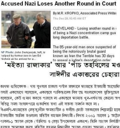 দুটো খবর এক সময়েই বের হলো। ষাট বছর পরও আইন নীরবে পিছু অনুসরন করছে। বাংলাদেশ থেকে হাজার মাইল দুরে ঘটনাটা ঘটেছে। দু'টো সম্পর্কবিহীন ঘটনা মানবতার এক সূতোয় বাঁধা। ইউক্রেনের ডিমানজানুক আর বাংলাদেশের পাবনার মইত্যা নিজামী মানুষের নিযর্াতন ও হত্যার সাথে জড়িত। ডিসেম্বরের 29 তারিখে এপি এই খবর পরিবেশন করে যে, পোল্যান্ডের ট্রেবলিংকা শিবিরে গণহত্যার জন্যে 85 বছর বয়সের ডিমানজানুক অভিযুক্ত। অন্যদিকে, বাংলাদেশের পাবনায় 1971 সালে গনহত্যার সাথে জড়িত নিজামী এখনো বিচারের সম্মুখীন হননি। তিনি এখন আমাদের শিল্পমন্ত্রী। ভোরের কাগজ ডিসেম্বরের 30 তারিখে 1971 সালে নিজামীর ঘৃণ্য অপকর্মের বিস্তারিত চিএ তুলে ধরে। আইন এখন হোক অথবা ষাট বছর পর হোক অপরাধীকে বিচারের কাঠগড়ায় দাঁড় করাবেই।