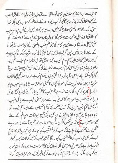 নবীর (হুযূর পাক ছল্লাল্লাহু আলাইহি ওয়া সাল্লাম-এর) যদি কিছু ইলমে গায়েব থেকেও থাকে তাহলে এতে তাঁর বিশেষত্ব কী? এমন ইলমে গায়েব তো সকল চতুষ্পদ জন্তু, পাগল ও শিশুরও আছে। নাঊযুবিল্লাহ! (আশ্রাফ আলী থানবী, হিফজুল ঈমান, পৃষ্ঠা ৭)