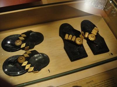 ৬) চামড়ার উপর সোনার বোতাম বসানো আফ্রিকার ঘানার জুতা।আফ্রিকার আসান্তে উপজাতির শাসকদের পা মাটি স্পর্শ করা নিষিদ্ধ। তাদের সোনার অলঙ্কার খচিত জুতা ছিল আভিজাত্যের প্রতিক। রাজার জুতা যদি ভেঙ্গে গিয়ে পা মাটি ছুয়ে ফেলে তো সর্বনাশ। সুতরাং রাজার সাথে সাথে অতিরিক্ত এক জোড়া স্যান্ডেল জুতা বয়ে নিয়ে যেত একজন জুতা বাহক।