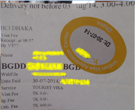 কাগজপত্র সব দেখে অফিসারটি ৪০০ টাকা চাইলেন।অফিসের ভেতরে ওয়ালে সাঁটানো কাগজে লেখা আছে- ভিসা সম্পূর্ণ ফ্রি , কেবল প্রসেসিং ফি বাবদ ৪০০ টাকা দিতে হবে।১০০০ টাকার একটা নোট দিলে ৬০০ টাকা ফেরত পেলাম। সাথে ঘট ঘট করে ডট প্রিন্টার থেকে বেরুনো একটা Delivery Slip.অফিসারটি স্লিপে হলুদ রঙা একখানা গোল স্টিকারও সেঁটে দিলেন।অনুরুপ আরেকটা স্টিকার পাসপোর্ট বইয়ের পিছনে সেঁটে পাসপোর্টটি জমা দেয়া কাগজে মুড়িয়ে রাখলেন।পাসপোর্ট বইয়ের কথা বলতেই অফিসারটি Delivery Slipটি যত্নে রাখার পরামর্শ দিলেন।কুলুপ আঁটা মুখ থেকে কেবল একখানা কথাই জানার সুযোগ হ’ল। আরও জানলাম আজ আর কোন কাজ নেই। ঢুকলাম ৮টা ৫০ মিনিটে। কাজ শেষ হলো ৯টা ৫৭ মিনিটে। স্লিপের উপরে অত্যন্ত কৌশলে লেখা –“Delivery not before 03 August, 3.00-4.00 pm. ”
