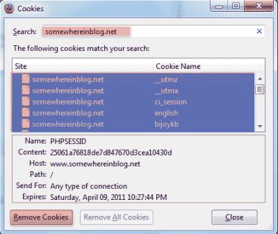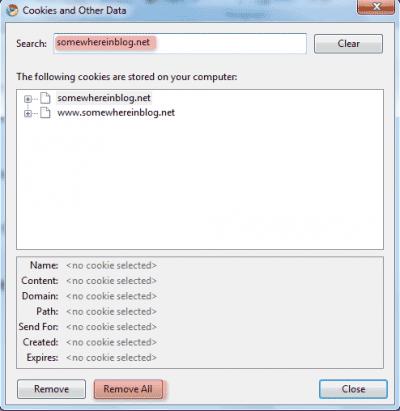 ২. এবার নিচের মত উইন্ডো ওপেন হবে এখানে somewhereinblog.net টাইপ করুণ এবং রেজাল্ট গুলো সিলেক্ট করে Remove Cookies বাটন এ ক্লক করে কুকি পরিষ্কার করুন।