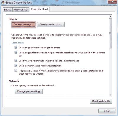 ২. এবার Options> Under The Hood যান এবং Content settings... বাটন এ ক্লিক করুণ।
