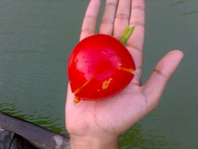 টকটকে লাল ফল নিয়ে আসল। মাঝির কথামতে ঐ ফল- পাহাড়ীরা খাবার হিসেবে ব্যবহার করে। সিরাজ ভাই যথারীতি উত্তেজিত, সবার আগে উনি খাবে- উনার বড় অংশ লাগবে ইত্যাদি। আমি বললাম এই সুন্দর নামনা জানা ফলের একখান ছবি তুইল্যা নেই। অবশেষে উত্তেজিত সিরাজ ভাই- ফলে বিশাল একখান কামড় লাগাল এবং তারপরেই উনি
