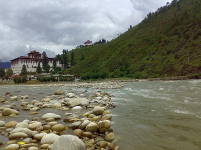 ছবিঃ পাহাড়ি নদী পারু এবং পিছনে প্রশাসনিক ভবন বা জং।