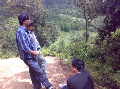 সেকেন্ডের জন্য যাত্রাবিরতি হল একটি ছোট পাহাড়ি ঝর্ণার সামনে। উপর থেকে নেমে আসা এই ঝর্ণাধারাকে একটি ঘুরন্ত মেশিনের মধ্য দিয়ে প্রবাহিত করে দুই ভাগে ভাগ করা হয়েছে। মেশিনটি একটি বন্ধ ঘরের মধ্য থাকায় মেকানিজম সম্পর্কে কোন ধারণা করতে পারলাম না, যদিও মেশিনের মেকানিজম নিয়ে আমাদের কোন মাথা ব্যাথা ছিল না। একটি ভাগের পানি থেকে কিছু আজলা ঠান্ডা পানি আমি আমার মুখে মাখলাম। তারপর আবার যাত্রা শুরু। এতক্ষণ পর্যন্ত আমাদের যাত্রা পথের দুই ধারে ছিল লম্বা-লম্বা গাছ যা দুপুর এগার-বারটার রোঁদ থেকে আমাদের ছায়া দিচ্ছিল। কিছুক্ষণ পরেই সেই ছায়াময়ি গাছের সারি ফুরালো। পর্বতের এক প্রান্তের এক চিলতে পথ দিয়ে ভেতো বাঙ্গালি চারজন এবং সাথে সুপার শক্তিশালি দুই ভুটানিজ রমণী এবং এক পুরুষের থেমে থেমে যাত্রা চলতে লাগল। এখানে বলাবাহুল্য- যাত্রা বিরতি হচ্ছিল আমাদের ভেতো বাঙ্গালীদের কারণেই, যার অধিকাংশ আবার মুন ভাইয়ের নিঃশ্বাসজনিত কস্টের কারণে। প্রতি যাত্রা বিরতিতেই মুন ভাইয়ের সকরুণ একইরকম আহাজারি- আমারে আপনারা মাফ করেন, আমি রাস্তার কিনারে একপাশে শুইয়্যা রইলাম, আপনার যান। যেহেতু ভুটানিজ রমনী দুইজন জাতিগত ভাবেই পর্বত আরোহণে ওস্তাদি তাই প্রতি যাত্রা বিরতেই তারা আমাদের অগ্রে অর্থাৎ রাস্তার উপরিভাগে আমাদের জন্য অপেক্ষা করত তারা দুইজন। একপর্যায়ে মুন ভাইয়ের