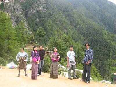 এভাবে একা একা যাত্রা শেষে একটু সমতলের মত জায়গায় এসে দেখলাম একটা ঘন্টা বাজছে ছোট্র একটা ঘরের মধ্য থেকে। ঘর না বলে ছাউনি বলাই ভাল। তার সামনে বসে এক তামিল ভ্রমণকারি পরিবার তাদের দুপুরের খাবার নিচ্ছে। আমি ছাউনির অন্যদিকে গিয়ে শুয়ে পড়ে আবার যাত্রা সঙ্গীদের জন্য অপেক্ষা করতে লাগলাম। অনেকক্ষণ পর আমাদের যাত্রা সঙ্গীদের দেখা মিলল। সমতল এই জায়গা থেকে একদিকে চলে গিয়েছে রেস্তোরার রাস্তা, অন্যদিকে উধ্বর্গামী পথ।এই জায়গা থেকে থাকসান মন্দির অনেক পরিস্কার দেখা যায়। বেশ কিছুক্ষণ ফটো সেশন করলাম,বলা বাহুল্য সারা রাস্তায় আমাদের ফটোসেশন অব্যহত ছিল।কিছু গ্রুপ ফটো তুললাম। গ্রুপ ফটো তুলার এক পর্যায়ে আমার পাশে দাড়াঁনো ভুটানি রমণী আমার কোমরে হাত দিল।