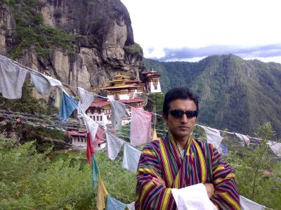 গিয়েছে। আমার কেবল হাফ ফুট পাশেই খাড়া পর্বতের ঢাল, পা একটু ফসকালে সোজা নিচে। তার উপর আমার অ্যাপেক্স জুতা দিয়ে পা হচকানোর রের্কড আছে, সাথে যোগ হল আমার উচ্চতা জনিত ভীতি। আমি তৎ ক্ষণাৎ সিদ্বান্ত নিলাম আমি আর নিচে যাব না। আমার অবশিস্ট সঙ্গীদের অপেক্ষায় রইলাম ঐ ঢালু জায়গায়। কিছুক্ষণ পর আমাদের অবশিস্ট পাঁচ সঙ্গীরা এসে হাজির হল। বাঙ্গালী তিন জনের মধ্য দুই জন দোটানায় পড়ে গেল যাবে কি যাবে না। ইতিমধ্য খাড়া এই রাস্তা বেয়ে উপরে উঠে আসল এক বাঙ্গালী-আমেরিকান দম্পতি। আমেরিকান পুরুষটি বলল-নিচের রাস্তা অনেক খাড়া এবং বিপদজনক। ভুটানিজ দুই রমণী এবং ভীমের উৎসাহে অবশিস্ট তিন বাঙ্গালী নিচে রওয়ানা দিল। আমি বাঙ্গালী-আমেরিকান যুগলের সাথে উপরে উঠে আসলাম। উপরে উঠে সেই উচু পর্বতের একপ্রান্তে বসার মত পাথুরে বেঞ্ছে অবস্থান নিলাম।বাঙ্গালী-আমেরিকান যুগল কিছুক্ষণ পর আমার থেকে গুড বাই নিয়ে ফিরতি পথ ধরল। আর আমি সমুদ্র সমতল থেকে দশ হাজার ফুটের মত উপরে একা অবশিস্ট সঙ্গীদের অপেক্ষায় রইলাম।