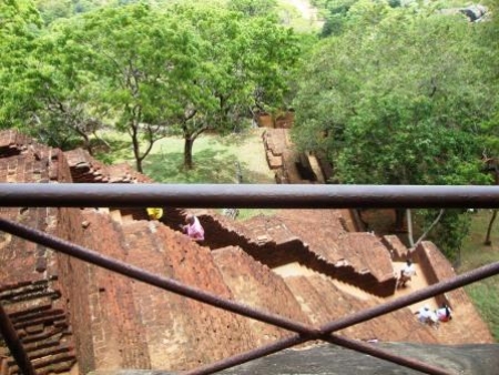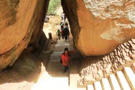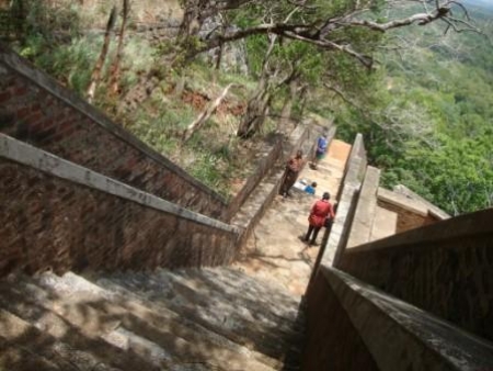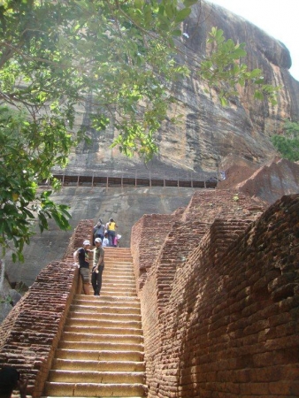 সিগিরিয়ার প্রাসাদ দুর্গের দিকে পাহাড়ের নিচে সিঁড়ি পর্যন্ত যাবার পাথর বিছানো পথটির দু পাশ ইট দিয়ে বাধানো। দেশ বিদেশের পর্যটকেরা পায়ে চলার যে পথ ধরে এগিয়ে চলেছেন এখন থেকে দেড় হাজার বছর আগে হয়তো রাজা কশ্যপের হাতি অথবা তাঁর ঘোড়ায় টানা রথ এই পথ দিয়েই আসা যাওয়া করেছে। কিছুটা দূরে দূরেই দু তিন ধাপ সিঁড়ি ভেঙ্গে পথের এক স্তর থেকে উপরের স্তরে উঠতে উঠতে পাহাড়ের গোড়ায় পৌঁছে দেখা গেল সেখানে পাহাড় ঘিরে সবুজের সমারোহ। পুরো এলাকাটা ছায়াঘেরা বলে রোদের তাপ সত্ত্বেও যথেষ্ঠ ঠাণ্ডা। সিঁড়ির মুখে দুটি প্রকাণ্ড পাহাড় পরস্পরের প্রতি ঝুঁকে পড়ে একটি বিশাল ত্রিভুজ তৈরি করেছে আর এই ত্রিভুজের ভেতর দিয়েই উঠে গেছে সিঁড়ি। ত্রিভুজটাকে বলা যায় প্রাসাদের অভ্যর্থনা ফটক। এখানে দাঁড়িয়েই উপরের দিকে একবার তাকিয়ে আটজনের দলে তৃতীয় বয়োজেষ্ঠ্য নয়ন ঘোষণা করে, ‘আমার যাত্রা এখানেই শেষ।এই হাজার ধাপ সিঁড়ি ভেঙে উপরে ওঠা আমার কর্ম নয়।’ পাহাড়ের চড়াই এবং পাহাড়ের পাথরের খাঁজে আটকানো ইস্পাতের মইসহ আসলেই সিঁড়ির সংখ্যা হাজার ধাপ কিনা তা বলা কঠিন, তবে সাধারণ হিসাবে একটা ষাট ফুট উচ্চতার দালানের ছাদে উঠতে যদি দুশ সিঁড়ি পার হতে হয়, তাহলে সাড়ে ছয়শ ফুট উচ্চতার পাহাড় চূড়ায় উঠতে দুহাজার সিঁড়িতে পা রাখতে হবে তাতে কোনো সন্দেহ নেই। যাই হোক, বয়সের কারণে না হলেও ‘ব্যাক পেইন’এর কারণে নয়নের সিঁড়ি ভাঙা বারণ বলে আমরা তাকে ফেলেই উপরে উঠতে শুরু করলাম।