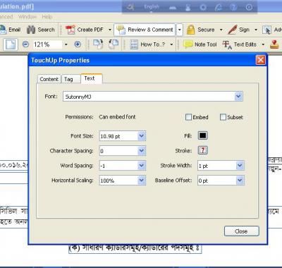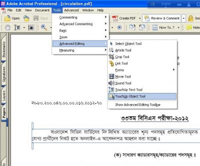 আপনার তৈরি ফাইলটি Adobe Acrobat Reader দিয়ে অন করে এর টেক্সট লাইনগুলো সিলেক্ট করুন। Tools>Advanced Editing>TouchUp Object Tool এ গিয়ে TouchUp Tool টি এক্টিভ করুন।