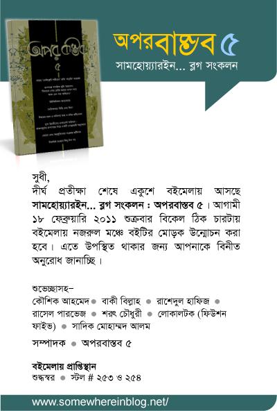 দীর্ঘ প্রতীক্ষা শেষে একুশে বইমেলায় আসছে সামহোয়্যারইন... ব্লগ সংকলন : অপরবাস্তব ৫। আগামীকাল ১৮ ফেব্রুয়ারি ২০১১ শুক্রবার বিকেল ঠিক চারটায় বইমেলায় নজরুল মঞ্চে বইটির মোড়ক উন্মোচন করা হবে। এ উপলক্ষে