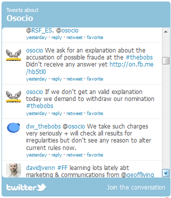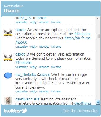 সেরা ইংরেজি ব্লগ বিভাগে মনোনয়ন পাওয়া সামাজিক বিজ্ঞাপন ও অলাভজনক ক্যাম্পেইন বিষয়ক বিখ্যাত ওয়েবসাইট 'অসোসিও' ভোট কেলেঙ্কারির প্রতিবাদে প্রতিযোগিতা থেকে তাদের নাম প্রত্যাহারের হুমকি দিয়েছে। তার এ হুমকির মুখে ডয়চে ভেলের কেন্দ্রীয় কর্তৃপক্ষ এক টুইটার বার্তায় জানিয়েছে, তারা ভোট জোচ্চুরির অভিযোগকে অত্যন্ত গুরুত্বের সঙ্গে নিয়েছেন।