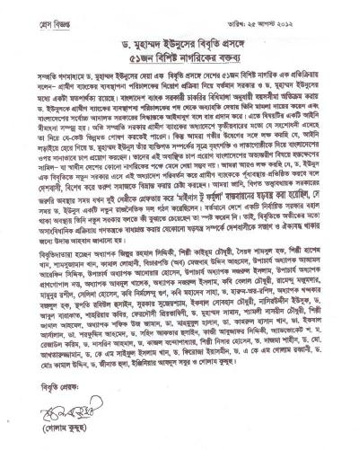 বিবৃতিদাতাদের নামগুলো একবার দেখে নিন- অধ্যাপক জিল্লুর রহমান সিদ্দিকী, শিল্পী কাইয়ুম চৌধুরী, সৈয়দ শামসুল হক, শিল্পী হাশেম খান, শামসুজ্জামান খান, কামাল লোহানী, বিচারপতি (অব.) মেজবাহ উদ্দন আহমেদ, ঢাকা বিশ্ববিদ্যালয়ের উপাচার্য অধ্যাপক আ আ ম স আরেফিন সিদ্দিক, জাহাঙ্গীরনগর বিশ্ববিদ্যালয়ের উপাচার্য অধ্যাপক আনোয়ার হোসেন, বঙ্গবন্ধু শেখ মুজিব মেডিকেল বিশ্ববিদ্যালয়ের উপচার্য অধ্যাপক প্রাণগোপাল দত্ত, বিশিষ্ট অর্থনীতিবিদ অধ্যাপক ড. আবুল বারাকাত, অধ্যাপক আবদুল খালেক, অধ্যাপক নজরুল ইসলাম, কবি বেলাল চৌধুরী, রামেন্দু মজুমদার, মামুনুর রশীদ, সেলিনা হোসেন, কবি নির্মলেন্দু গুণ, কবি মহাদেব সাহা, ড. হারুন-অর-রশিদ, অধ্যাপক খন্দকার বজলুল হক, স্থপতি রবিউল হুসাইন, সুরকার সুজেয় শ্যাম, সাংবাদিক ইকবাল সোবহান চৌধুরী, অভিনেতা-পরিচালক নাসিরউদ্দীন ইউসুফ, লেখক-সাংবাদিক শাহরিয়ার কবির, শিল্পী ফেরদৌসী প্রিয় ভাষিণী, ড. মুহাম্মদ সামাদ, শহীদ জায়া শ্যামলী নাসরীন চৌধুরী প্রমুখ।