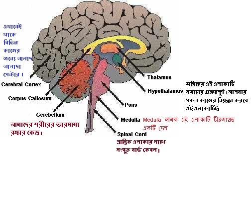 Medulla নামক এই এলাকাটি চীরজাগ্রত একটি দেশ ।এখানে আপনি ঘুমপরীদের খুঁজে পাবেন না ।কারন এই এলাকার জনগণ (মানে নিউরোন)ঘুমায় না কখোনও কারন এরাই আপনার জীবনের সবচেয়ে প্রয়োজনীয় কেন্দ্র যেমন হার্ট-রেট নিয়ন্ত্রন কেন্দ্র (Heart rate control centre), শ্বাস-প্রশ্বাস নিয়ন্ত্রন কেন্দ্র (Centre for Breathing)কব্জা করে রেখেছে । তাই এদের ঘুমানোর কোনও সুযোগ নেই ।এরা যদি ঘুমিয়ে পড়ে, জানবেন আপনি “ওয়ান-ওয়ে টিকিট” কেটে ফেলেছেন । এই Medullaই স্পাইনাল কর্ডে এসে শেষ হয় । আপনার স্পাইনাল কর্ডটিই মস্তিষ্কের প্রধান কমিয়্যুনিকেশন কেবল যা আপনার মেরুদন্ডের হাড়ের ভিতর দিয়ে নীচে নেমে গেছে । এই কর্ডের মাধ্যমেই আপনার শরীরের প্রত্যন্ত এলাকা থেকে মস্তিষ্কে চলে আসে যাবতীয় সংবাদ । সংবাদগুলো হতে পারে স্পর্শ, স্বাদ, ব্যথা, শীত কিম্বা গরমের অনুভুতি ।নিউটনের তৃতীয় সূত্র – এ্যাকশান ইক্যুয়াল টু রিএ্যাকশানের মতো এই অনুভুতিগুলোর প্রতিক্রিয়াই আবার আপনার মস্তিষ্ক থেকে স্পাইনাল কর্ড বেয়ে প্রয়োজনীয় অঙ্গ-প্রত্যঙ্গে পৌছে যাবে । সুতরাং স্পাইনাল কর্ডে দু’ধরনের তার (Cable) থাকতে হবে ।আপনার গৃহকর্মে ব্যবহৃত প্রচলিত ইলেকট্রিক তারে যেমন দু’রঙের তার দেখতে পান তেমনটি । এর একটিকে আমরা বলি – Sensory fibre যা অনুভুতিগুলোকে মগজে নিয়ে আসে আর অন্যটি হলো Motor fibre যা মগজের নির্দেশকে পৌছে দেয় প্রান্তীয় অঞ্চল পর্য্যন্ত ।