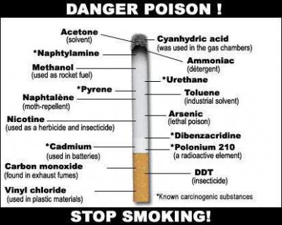 সিগারেটে যে স্বাস্হ্যের জন্য অনেক ভয়ংকর ক্ষতিকারক মাল আছে তাদের কয়েকটা হল: