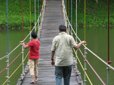 আমরা এগিয়ে যেতে থাকলাম। ২৩২৩২ ফুট উপরে একটি নদী আছে।তার উপর কাঠের এক ব্রিজ।অপর প্রান্তে একটা টয়লেট।ব্রিজটি একজনের ভার সহ্য করতে পারে কিনা সন্দেহ ! কিন্তু সুননের হঠাৎ বাথরুম চাপায় ২ জন করে আমরা পাড় হলাম। ছবিতে দেখুন কাপড়ের দড়ির তৈরি রেলিং ধরে ধরে কি কষ্ট করে আমরা পাড় হচ্ছি।