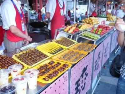 ফরবিডেন সিটিতে যাবার পথেই, রাস্তার পাশে ফুটপাথে বিকাল থেকে সারারাত লাইন ধরে চালু চাইনীজ জনপ্রিয় খাবার। এখানে তিন চারটা মুসলমান পরিচালিত হালাল খাবারের দোকানও আছে যেখান থেকে আমরা ল্যাম্ব আর চিকেন স্টিক কিনে খেয়েছি কয়েকদিন, সেই সাথে কাঠিতে গাথা বিভিন্ন রসাল ফলের টুকরো, যা আবার গরম চিনির সিরায় ডুবিয়ে একটু শক্ত করে রাখা ।ভীষন মজার।