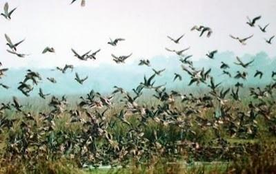 সন্ধ্যায় জলাভুমি থেকে উড়ে যাওয়া বুনো হাঁসের ঝাঁক