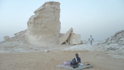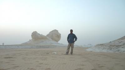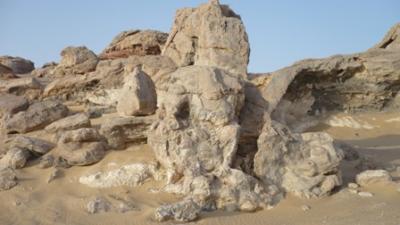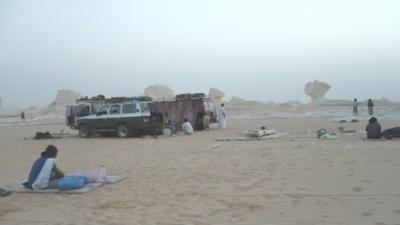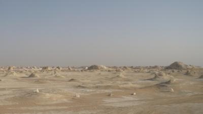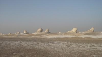 সন্ধ্যা হয়ে আসছে আহমাদ গাড়ীতে উঠার জন্য ডাকলো।চারটা জীপ রেডী।আহমাদ প্রথমে তার গাড়ী স্টার্ট দিল সে হচ্ছে দলনেতা। অন্ধকার হয়নি তখনো, আমরা পাহাড় পর্বত উচু নীচু পেরিয়ে যাচ্ছি। হঠাৎ গোধুলীর আলোয় বাইরে তাকিয়ে দেখি অদ্ভুত এক জগতে আমাদের প্রবেশ। মনে হলো অন্য কোথাও চলে এসেছি মহাকাশের অন্য কোনো গ্রহে ।চারিদিকে সাদা পাথরের বিভিন্ন আকৃতির সব অপরূপ মুর্তি যার থেকে নরম সাদা দুধের মতন এক আলো বিচ্ছুরিত হচ্ছে চারপাশে। বিস্তীর্ন প্রান্তর জুড়ে সেই মুর্তি কোথাও ঘন কোথাও বা ছড়ানো ছিটানো। বিস্ফারিত নেত্রে চেয়ে দেখছি প্রকৃতির তৈরী সেই ভয়ংকর সৌন্দর্যের দিকে।আহামাদ জানালো এটাই সেই বিখ্যাত হোয়াইট ডেজার্ট।