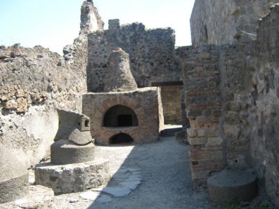 লাভার নীচ থেকে খুড়ে বের করা বেকারী যার চারিদিকে রুটি বানানোর উপকরণ ছড়িয়ে ছিটিয়ে আছে।
