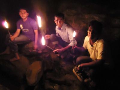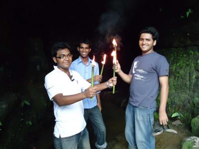 বাসের হেল্পারকে আগেই বলে রেখেছিলাম আলুটিলা নামিয়ে দিতে। তিন ঘন্টার বাস জার্নিটাকে চার ঘন্টা বানিয়ে খাগড়াছড়ি শহরের প্রায় ছয় কি.মি. আগে বাস নামিয়ে দিলো আমাদের গন্তব্যস্থল আলুটিলায়। অনেকেই হয়তো জানেন আলুটিলা বিখ্যাত তার রহস্যময় সুড়ঙ্গের কারনে। আমাদেরও ব্যাপারটা আগে থেকেই জানা ছিলো। তাই আলুটিলায় নেমেই আমাদের মধ্যে একটা অ্যাডভেঞ্চার অ্যাডভেঞ্চার ভাব চলে এলো। পাঁচ টাকা দিয়ে টিকিট কেটে ঢুকে পড়লাম। প্রবেশ মুখেই দেখতে পেলাম পর্যটকদের আকর্ষণ করতে আলুটিলা কর্তৃপক্ষের সাইনবোর্ড। অনেক খানি হেঁটে আর প্রায় শ’খানেক ধাপ সিড়ি ভাঙ্গার পর গিয়ে মিললো সুড়ঙ্গ মুখের দেখা। বন্ধু রউফ মোবাইল টর্চের আলোতে সুড়ঙ্গের ভেতর ঢুকে পড়লো। তবে কিছুদূর গিয়েই বোঝা গেলো এরকম ঘুটঘুটে অন্ধকারে সুড়ঙ্গ জয় সম্ভব নয়। তাছাড়া কোন কারন ছাড়াই গা ছম ছম করছিলো। তাই আবার ফিরে গিয়ে মশাল কিনে আনলাম। সুড়ঙ্গের পথ কিছুটা কর্দমাক্ত ও পিচ্ছিল। তলদেশে প্রবাহমান ঝর্না। মাথার উপর ঘুটঘুটে অন্ধকারে বাদুড়ের কর্কশ চিৎকার। পাহাড়ের নীচে খুব সাবধানে মশাল নিয়ে সুড়ঙ্গের ভেতর যেতে হয়। এভাবে মিনিট দশেক যাওয়ার পর পাওয়া গেলো সুড়ঙ্গের অপর প্রান্ত। বেশ একটা অ্যাডভেঞ্চার হয়ে গেলো ভাব নিয়ে আমরা মনোযোগ দিলাম মশাল হাতে ফটোসেশনে।