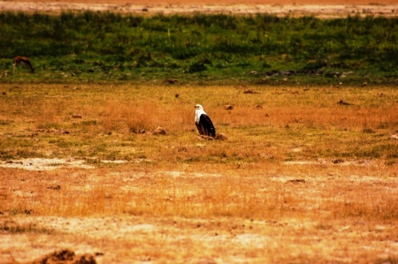 তখনই চোখে পড়ল তাকে। মাছের যম আফ্রিকান মেছো ঈগল (Haliaeetus vocifer) রাজকীয় ভঙ্গিমায় বসে আছেন জলাভূমির কাছে।