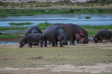ধুলাময় রাস্তা ছেড়ে আমরাও চলে এসেছি জলাভূমির কাছাকাছি। সামনে পড়ে গেল একপাল জলহস্তী