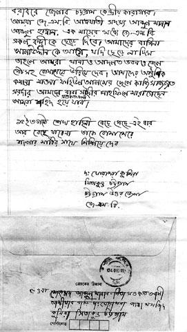 চিঠিতে দুজনের পরিচয় দিয়ে বলা হয়, ‘আমরা জেএমবির আত্মঘাতী স্কোয়াডের সদস্য আবদুল মান্নান ও আবদুল হান্নান। এক মাসের মধ্যে জেএমবির সব বন্দীকে ছেড়ে দিতে হবে। সবার আগে আমাদের ভাগ্নে আলাউদ্দিনকে মুক্তি দিতে হবে। তাকে ছেড়ে দেওয়া না হলে থানা, আদালত ভবন ও কারাগার বোমা মেরে উড়িয়ে দেওয়া হবে।’