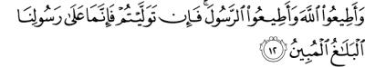 অনুবাদ :এবং আল্লাহর নির্দেশ মান্য কর এবং রাসুলের নির্দেশ মান্য কর । অতপর: যদি তোমরা মুখ ফিরি্যে নাও , তবে জেনে রেখ , আমার রাসুলের ওপর শুধু সুস্পস্ট রূপে পৌছিয়ে দেয়াই ( জরুরী মাত্র ) ।