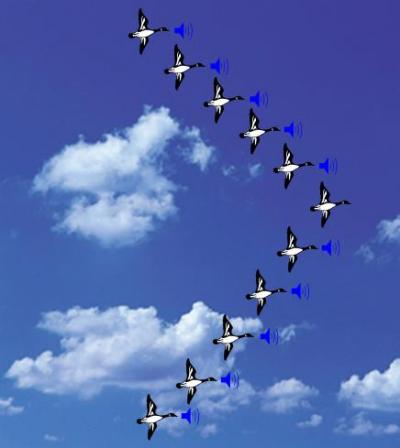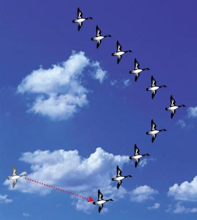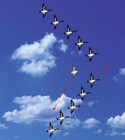 সামনের দলনেতা পাখিটি বাতাসের সবচেয়ে বেশি বাধা অনুভব করে, এবং ক্লান্ত হয়ে গেলে পাখা ঝাপটানোর বেগ কমিয়ে দিয়ে এটি ঝাঁকের পেছন দিকে সরে আসতে থাকে। পেছনের আরেকটি পাখি তখন নেতার স্থানটি গ্রহণ করে।