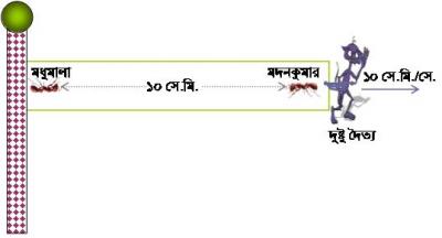 হ্যাঁ, বলছিলাম ভালোবাসায় বাঁধা-বিপত্তির কথা। তালপুকুরের দুষ্টু দৈত্য একদিন প্রতিহিংসাবশত বন্দী করে ফেলল মধুমালা-মদনকুমারকে। তারপর স্থিতিস্থাপক একটি রাবারের ফিতার দুই মাথায় ১০ সে.মি. দূরত্বে রেখে বসিয়ে দিল তাদেরকে। আর নিজেদের দেখতে পেয়ে খুশিতে মধুমালা মদনকুমার পরস্পরের দিকে প্রতি সেকেন্ডে ১ সে.মি. বেগে দৌঁড় শুরু করল।
