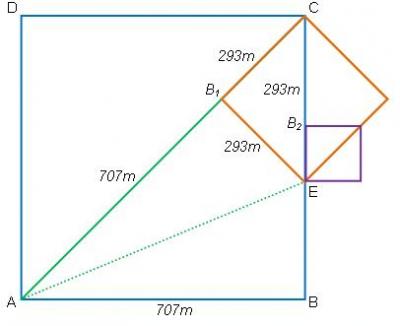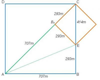 "এখন ছোট বর্গের বাহু, CB1=1000m-707m=293m (=EB1)।