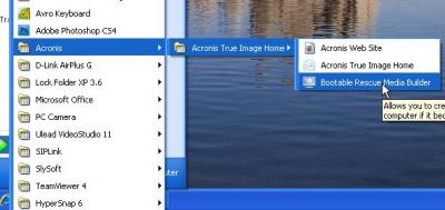 আপনি যদি সফল ভাবে Acronis True Image Home 2009 ইনষ্টল করে থাকেন তাহলে এবার Start মেনুতে গিয়ে Acronis True Image Home 2009 সিলেক্ট করে Bootable Rescue Media Builder এ ক্লিক করুন। নিচের ছবির মত। এ ক্ষেত্রে আপনাকে থাকতে হবে সিডি রাইটার ও একটা Blank CD. যদি না থাকে তাহলে এই অপশনটি বাদ দিন। এই সিডির কাজ হলো কখনো উইন্ডোজ রান না হলে এই বুটেবল সিডি দিয়ে আপনি আপনার ফাইল রিস্ট্রোর করতে পারবেন।