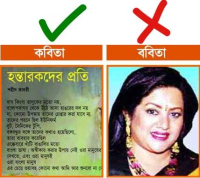 সর্বসাধারণের এতো ক্ষোভ, এতো প্রতিবাদ আর এতো জুতাপেটার পরও সামহোয়্যারের প্রথম পাতায় পাঁচ-ছয়টি কবিতা (?) থাকছেই। বিনামূল্যের ব্লগে সব শালা কবি হয়ে উঠেছে। আস্কারা পেয়ে পেয়ে তারা এখন অপ্রতিরোধ্য, থামানো যাচ্ছে না কিছুতেই। খেয়াল করে দেখুন, ব্লগে কবিতার নামে যা লেখা হচ্ছে, প্রায় সবই আসলে ববিতা। আমাদের চিত্রনায়িকা ববিতা!