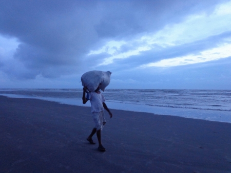 বেলাশেষের ক্লান্ত পথিক যখন বাড়ি ফিরছিলেন তখন এই ছবিটি তোলা। সন্ধ্যাবেলার ক্ষণকালের মোহনীয় আলোয় কলাতলী সৈকতের এই ছবিটি তুলতে বেশ ঝক্কি পোহাতে হইছিল। ওনাকে বললাম, "চাচা, আপনার একটা ছবি তুলবো?" উনি সম্মতি দেওয়ার পর যেই ক্যামেরায় ক্লিক করতে যাবো অমনি উনি দাঁড়িয়ে যাচ্ছিলেন। উহু, হচ্ছে না কিছুতেই... ওনাকে যতই বলি যে, এভাবে দাঁড়িয়ে গেলে তো হবে না। কিন্তু কে শোনে কার কথা। এদিকে চারপাশ দ্রুত অন্ধকার হয়ে আসছিল। এক পর্যায়ে আমি বললাম, "চাচা মিয়াঁ, আপনে আপনার মতো হেঁটে চলে যান। আপনার অন্য কোন চিন্তা করা লাগবে না।" উনি এই কথা শুনে যেই না হাঁটা ধরলেন অমনি দিলাম একটা ক্লিক।
