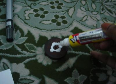 এবার আমি কাঠমিস্তরীর ফেলে দেওয়া টেবলের পায়ার বাড়তি অংশটুকুতে আইকা লাগালাম। (যেকোনো বোতলের মুখ বা কার্ডবোর্ড বা শক্ত কাগজ ও ব্যাবহার করা যেতে পারে এই অংশে)বসিয়ে দিলাম তাতে নববিবাহিত পুতুলদুটোকে।