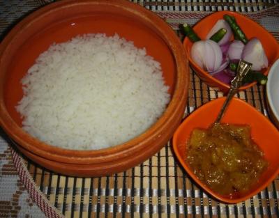 পান্তা, ইলিশ সরষে, কাঁচা মরিচ ও পেঁয়াজ দিয়ে।