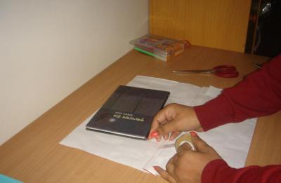 একসাইডে ডিজাইনটা রেখে বইটাকে সাধারন ভাবেই মুড়িয়ে নিয়ে টেপ আটকাই।