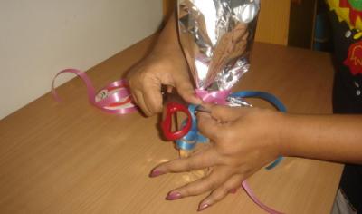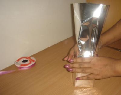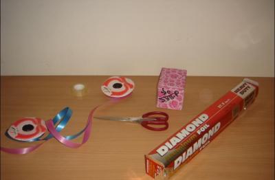 এখানে নিয়েছি প্লাস্টিক রিবন, সেলোটেপ, কাঁচি, র্যাপিং পেপার হিসাবে নিয়েছি কিচেন ফয়েল
