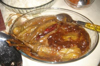 ডাঁটা সহ বেগুন ফুলের মত করে চিরে নিতে হবে। হলুদ লবন মাখিয়ে ভেঁজে তুলতে হবে।তেলে পিঁয়াজ লাল করে ভেঁজে পাঁচ ফোড়ন,শুকনা মরিচ,তেজপাতা দিয়ে ভেজে বাকী সব মসলা কষিয়ে নিতে হবে।বেগুন দিয়ে নেড়ে তেঁতুলগোলা আর চিনি দিয়ে অল্প আঁচে কিছুক্ষণ রাখতে হবে।