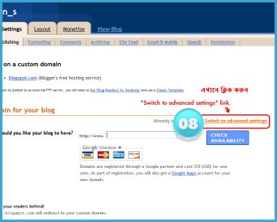 এবার আপনার কাজ গুগলে ব্লগে এই ডমেইন সেট করা। http://www.blogger.com এখানে গিয়ে আপনি আপনার গুগল আইডিতে লগিন করুন। আপনার পছন্দ মত নামে একটা ব্লগ ওপেন করুন। ব্লগ ওপেন করা শেষ হলে সোজা চলে যান Settings এ। Settings এ ক্লিক করার পরে নিচে Publishing আছে তাতে ক্লিক করুন।